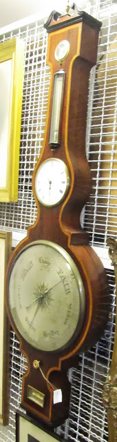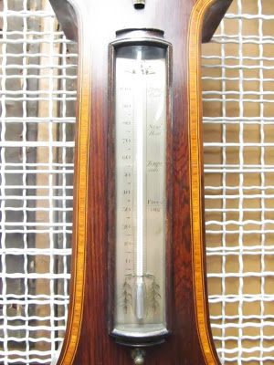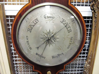 It’s about time for my annual heat wave post (check out last year’s post for some great Cruikshank illustrations on how to beat the heat). According to the weather forecasts, we are finally due for some heat-clearing storms, so I thought I’d highlight an item which could be used in understanding and predicting the weather. It is a wheel barometer. (I apologize for the poor image: it is in storage and I couldn’t get far enough away to shoot it square-on).
