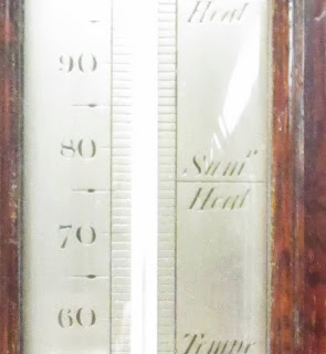 It may be hard to see in this picture, but the thermometer is marked at several important points, such as freezing and “blood heat.” I also noticed that “Sumr heat” is clearly marked–right at 76 degrees! Of course this was made in England, which is cooler than here, but they are having their own heat wave now and would probably be quite glad for that level of “summer heat”.