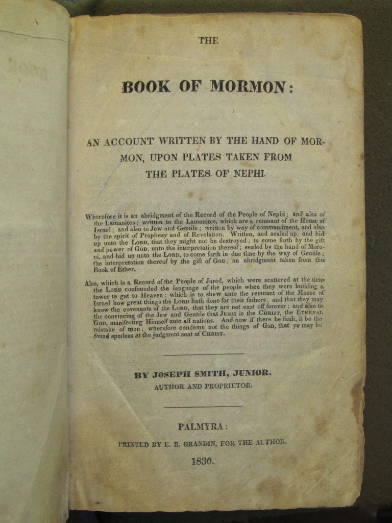 An American-Born Faith was co-curated by Alison Freyermuth, head of the Free Library’s Rare Book Department, and Kathy Haas, associate curator at the Rosenbach, and the exhibit features materials from across the Free Library and Rosenbach collections. As one might expect, both collections include first editions of the Book of Mormon, which was published in 1830 (one of the Rosenbach’s two copies is shown below).