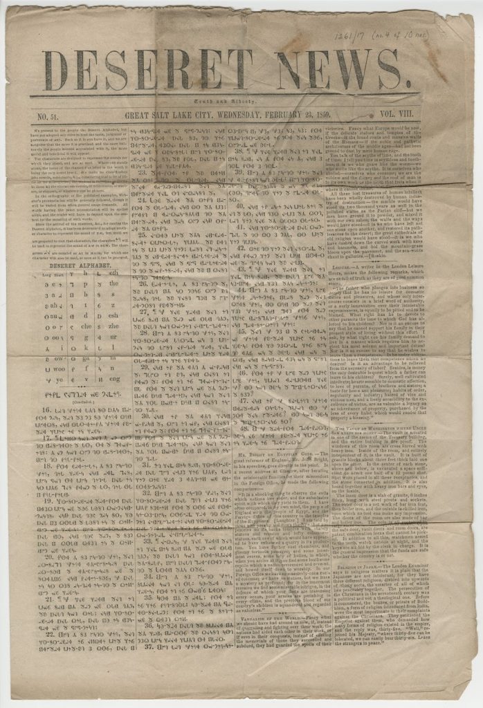 Only four books were printed in Deseret, of which the Rare Book Department has three. The alphabet was also promoted through other printed pieces like the Deseret News, as in this copy below from the Rosenbach’s collection. (As an aside, the term Deseret, which the Saints used as the name for their Utah settlement, comes from the Book of Mormon and means “honeybee”)