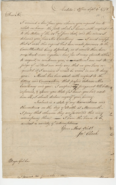 The Rosenbach letter is to Lee from John Clark, a major and auditor of accounts for the army, who was at the battle. It  is clearly a response to a request by Lee for Clark’s account of the events. It was written after the July-August court martial, but may possibly have been requested as part of Lee’s attempt to get Congress to overturn the conviction.