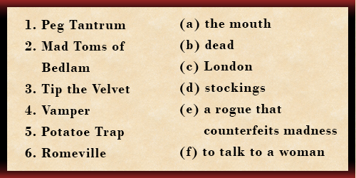Perhaps there is also the pleasure in deciphering a code or unravelling a riddle: if a potatoe trap isn’t a device to catch tubers, then what is it? It’s a little linguistic puzzle to solve. See if you can match the meaning to the cant below. The answers are at the bottom of this post; click and drag to highlight and make them appear.
