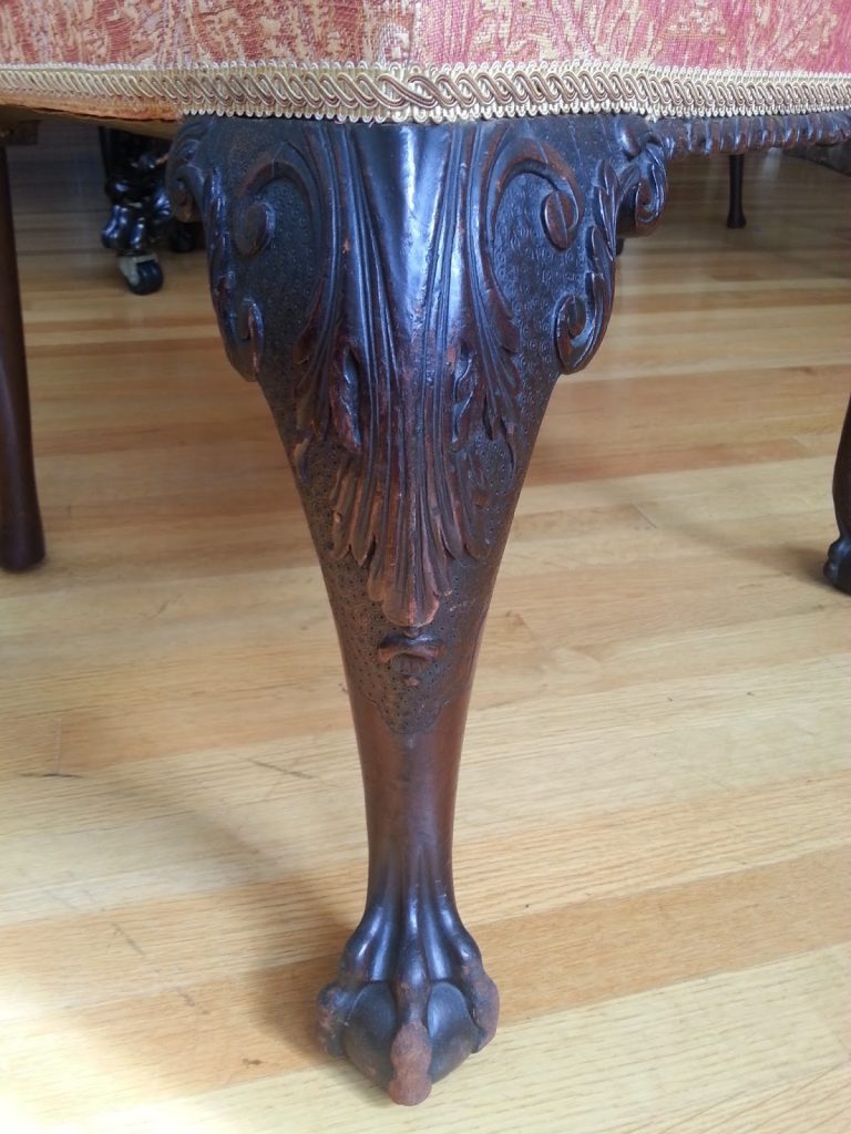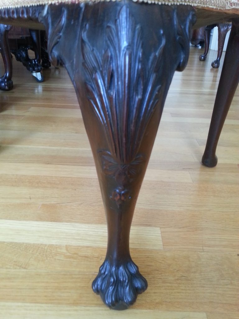 There are six of the chairs around the table, but the Rosenbach owns a total of eleven with the same back design. If you look closely you’ll notice that these the eleven chairs are actually from two sets: seven have paw feet and upward-pointing acanthus leaves on the “knee” and four have ball-and-claw feet and downward-pointing acanthus with a punched background.