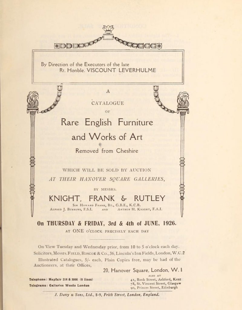 Following the first Viscount’s death, there were several auctions of sections of his collections from his many homes, including one of “Rare English Furniture and Works of Art Removed from Cheshire” on June 3-4, 1926.
