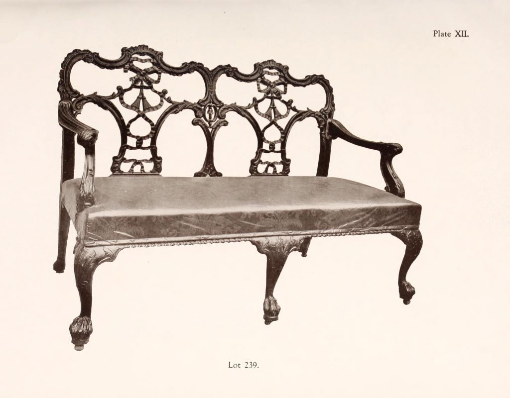 Philip bought the whole set and sold the settee in 1930 to Mrs. Blakemore Wheeler of Louisville, Kentucky. In a letter to Mrs. Wheeler, Philip described his purchase of the set (which he noted was “old but not a period piece,” e.g. not from Chippendale’s time) :