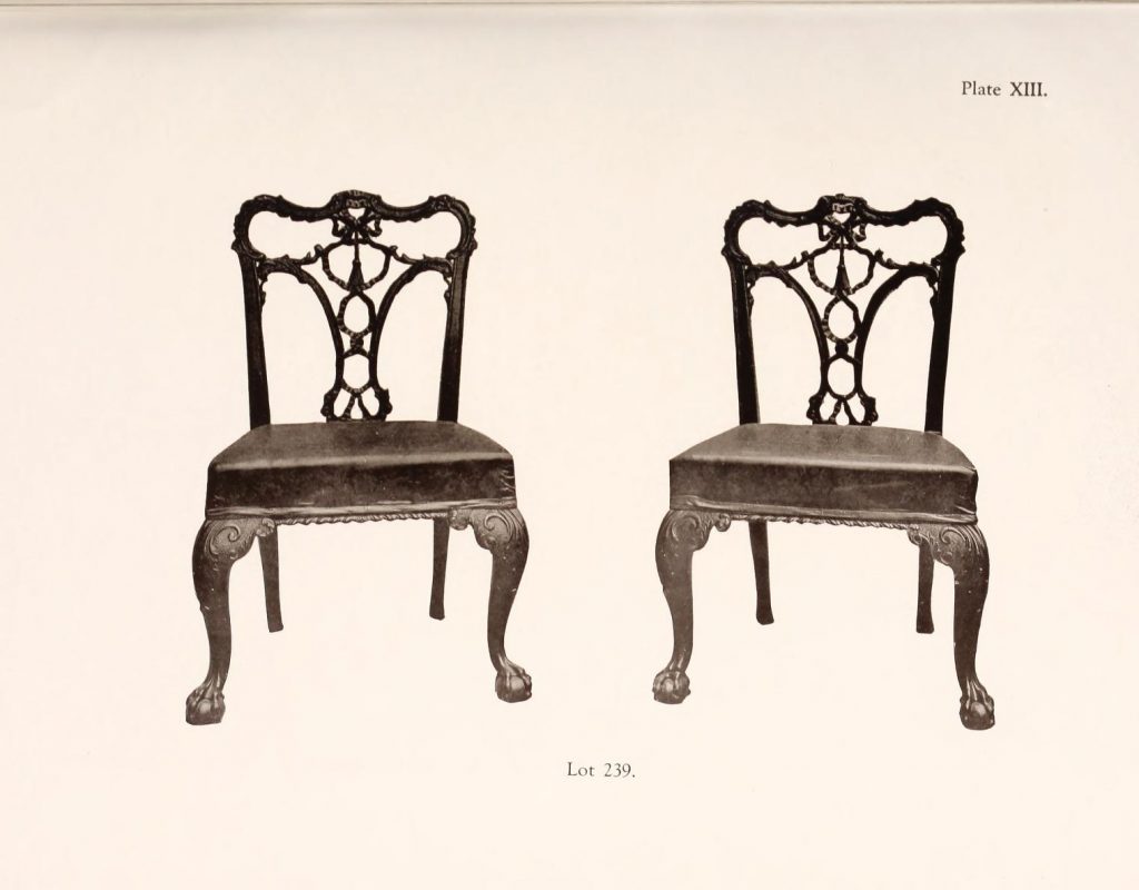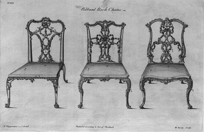 The chairs are in a mid-18th century rococo style, often called Chippendale after Thomas Chippendale’s pattern book The Gentleman and Cabinet-maker’s Director, which was first published in 1754. In fact, the design of the back of this chair is copied directly from plate XVI of Chippendale’s Director (shown below–look at the chair on the left). However, although the chairs are designed from Chippendale’s book, they