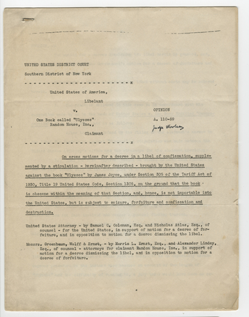James Joyce's Ulysses Collection: Woolsey Decision in U.S. vs. One Book Called Ulysses
