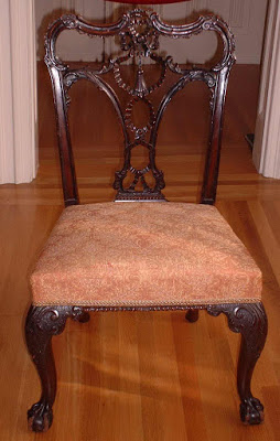 Following up on last week’s post on our cockfighting chair, I thought I’d highlight another interesting set of chairs in our collection in anticipation of next Thursday’s conversation on the history of the chair with Witold Rybczynski. If you’ve been on a Rosenbach house tour, you’ve seen these English mahogany chairs around the dining room …