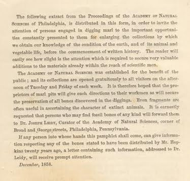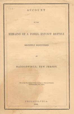 Anyway, back to our pamphlet. The fossils were found on the land of Mr. John Estaugh Hopkins, who had dug up a few bones in 1838 and put them in his home as curios. Twenty years later, in 1858, William Parker Foulk, a Philadelphia lawyer and fossil hunter, saw the bones and asked for permission to dig for more. He enlisted the help of his friend Dr. Joseph Leidy, at the Academy of Natural Sciences, to research and make sense of the fossils, and it was Leidy who named the species. The Rosenbach pamphlet is a reprint of a portion of the Proceedings of the Academy for 1858, which describes the discovery, provides a detailed description of the bones that were found,etc. This extract was apparently prepared in pamphlet form so it could be distributed to people who might be digging marl, as a way of alerting them to the potential for scientifically important discoveries and to enlist their cooperation in securing and preserving anything that might turn up. They also hoped they might be able to locate some of the bones from the original 1838 find.