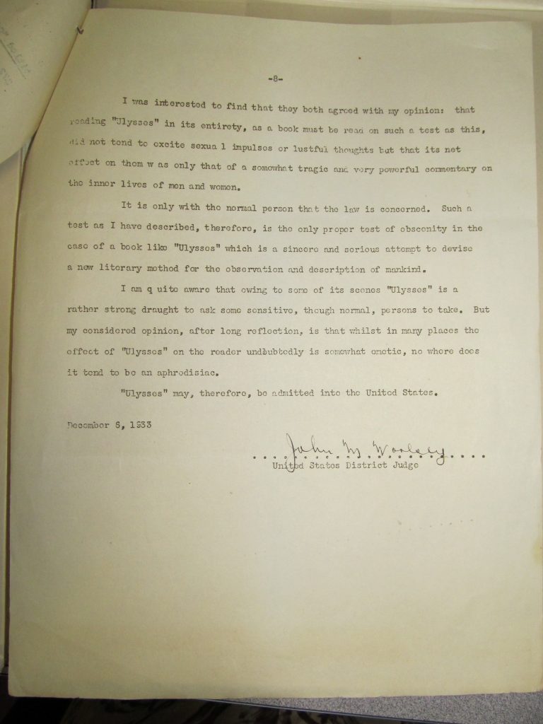Finally, in 1933, Joyce was able to find an American publisher, Random House, willing to challenge the ban in court by first printing the novel and then having a copy seized by U. S. Customs. One week after the repeal of Prohibition in December 1933, the judge in the case stated (to paraphrase) that Ulysses was unusually frank, but not pornographic and ruled that the ban was to be repealed. See The Rosenbach’s copy of the ruling below. Random House issued the first New York edition of Ulysses in 1934.