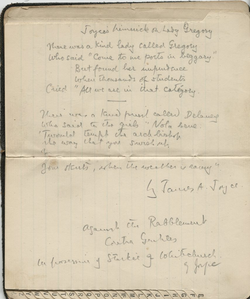Now, on this happy note, I did promise last week that I would share two additional Joycean rhymes with you. Thank you, for posting yours, of course, and please keep them coming! As you recall, Joyce wrote a little rhyme scolding Dr. Rosenbach for misspelling Ulysses in a cable—and possibly out of a bit of pique for the low price Dr. R. paid for his manuscript at auction. Despite Joyce’s lack of reply, Dr. Rosenbach pursued him further, obtaining a letter of introduction from John Quinn the month after the sale of the manuscript. Although many would like to imagine a meeting between the two, it seems never to have occurred. Yet, in Dr. R.’s travel notebook for 1928, there are two limericks attributed to Joyce: