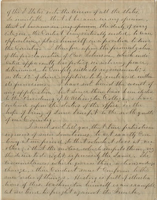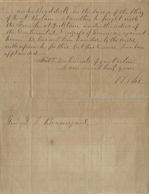Robert E. Lee , autograph letter signed to G.T. Beauregard, Lexington, Va., 3 October 1865. AMs 540/28 3rd Oct 65 My dear Gen’l, I have rec[eive]’d as your letter of the 1st Ulto: and am very sorry to learn that the papers of yourself and Johnston are lost, or at least beyond your reach. But I hope they may be recovered, mine cannot be, though some may be replaced. Please supply all you can. It may be safer to send them by private hands if practicable or by express to Mr. James Caskil at Richmond or to me at this place. I hope both you and Johnston will write the history of your campaigns. Every one should do all in his power to collect and disseminate the truth, in the hope that it may find a place in history and descend to posterity. I am glad to see no indication in your letter of an intention to leave the country. I think the South requires the aid of her sons now more than at any period of her history. As you ask my purpose I will state that I have no thought of abandoning her, unless compelled to do so. After the surrender of the S. Armies in April, the revolution in the opinions and feelings of the people seemed so complete and the return of the S. States into the Union of all the States so inevitable; that it became in my opinion, that it became in my opinion the duty of every citizen, the Contest being virtually ended, to cease opposition, and place himself in a position to serve the Country. I therefore upon the promulgation of the proclamation of Pres. Johnson, which indicated apparently his policy in restoring peace, determined to comply with its requirements; and on the 13th of June, applied to be embraced within its provisions. I have not heard the result of my application, but since then have been elected to the Presidency of Washington College, and have entered upon the duties of the office in the hope of being of some benefit to the noble Youth of our Country. I need not tell you, that true patriotism requires of men sometimes, to act exactly contrary at one period, to that which it does at another; and that the motive which impels them in the desire to do right, is precisely the same. The circumstances which govern their actions undergo change, and their Conduct must Conform to the new order of things. History is full of illustrations of this. Washington himself is an example, at one time he fought against the French, under Braddock, in the service of the King of Great Britain; at another he fought with the French at Yorktown, under the orders of the Continental Congress of America, against him. He has not been handled by the world with reproach for this, but his course has been applauded. With sentiments of great esteem, I am most truly yours, R. E. Lee
