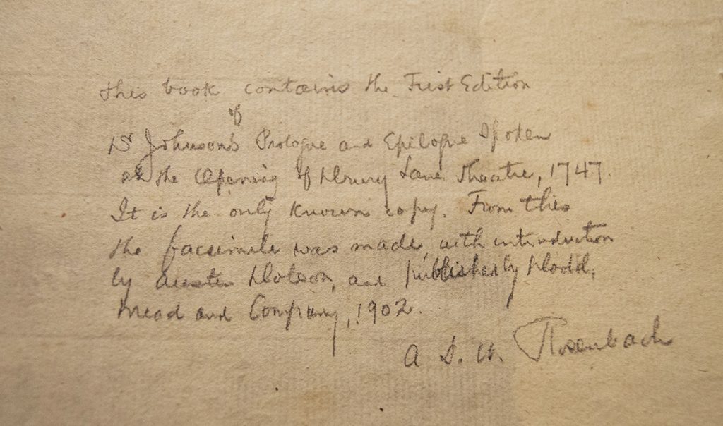 Abe Rosenbach’s first collecting coup was in 1901, when he was in his mid-twenties. While flipping through a series of bound pamphlets at an auction, some poetry printed by the amateur architect and gothic novelist Horace Walpole caught his eye. Unbeknownst to young Abe, Samuel Johnson’s Prologue and Epilogue spoken at the opening of the Theatre in Drury Lane 1747 was bound among the poems as well.