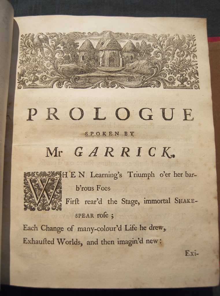 Johnson had written the Prologue to be read by his friend and former student David Garrick, then a rising young actor, for the reopening of the Drury Lane theater, whose patent Garrick had just purchased. After reading the Prologue the first four nights of the reopened theater’s first production (Merchant of Venice), Garrick took ill, and was unable to read it the fifth night. The Prologue was printed to mollify disappointed theater-goers, and for many years this souvenir consolation prize was thought to be lost to history. You can imagine what an electrifying moment it was in the life of a budding book collector (and Shakespeare fan) to discover the lost first edition of a poem written by Samuel Johnson for David Garrick to read. Dr. Johnson is remembered as one of the greatest Shakespearean critics of all time, and David Garrick as one of the bard’s most illustrious interpreters.
