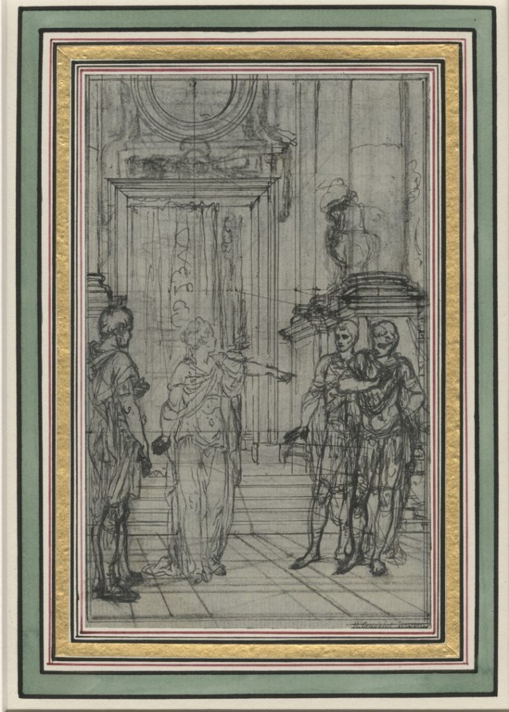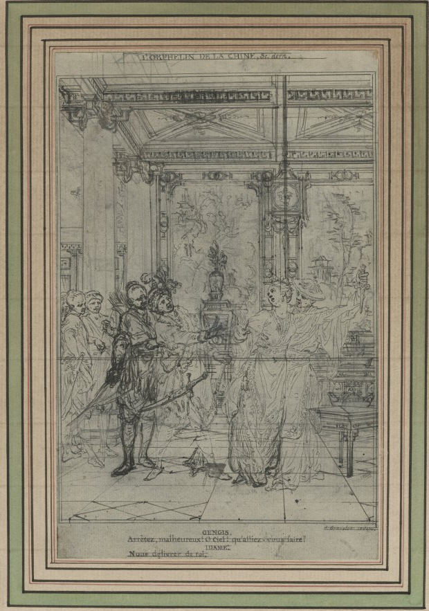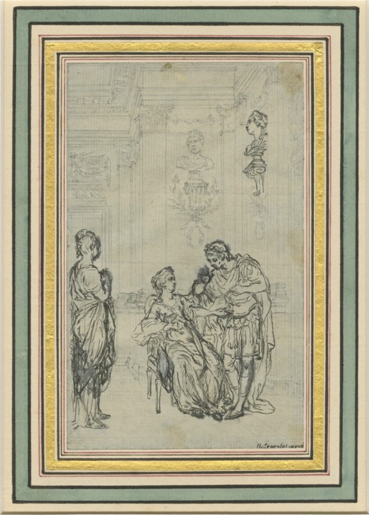 Gravelot includes Rococo designs in his carefully constructed drawings of interior spaces. For example, in his drawing for the play L’Orphelin de la Chine elegant,looping designs decorate the walls. The Rococo elements are toned down for his drawing of the play Berenice by Jean Racine, but it is still easy to notice the small details that adorn his spaces.Even his decorative works bring to mind fancy Rococo features.