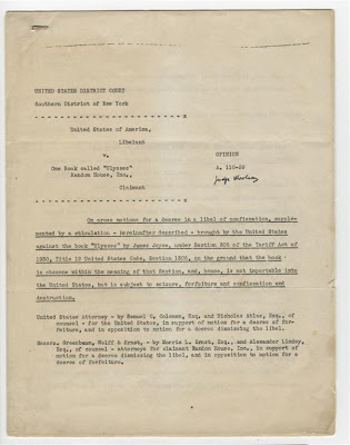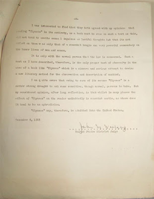 In honor of Joyce’s and Ulysses’s birthdays, I thought I’d highlight a new acquisition, which relates to our right to enjoy that book here in the United States. Last year we acquired a signed copy of the Woolsey decision in the 1933 case, United States vs. One Book Called Ulysses, which which overturned the 1921 obscenity ban on publishing or importing Ulysses.