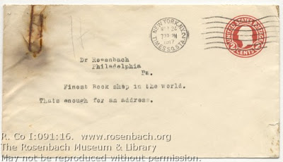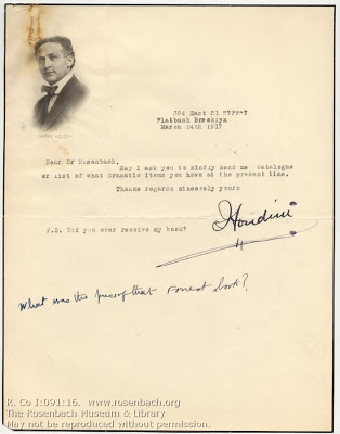Houdini accumulated a vast library (now at the Library of Congress) and in 1917 he sent a letter to the Dr. Rosenbach seeking books for it relating to the stage. The letter came in an envelope with what has to be one of the greatest addressings in postal history. Behold: