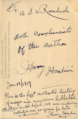 4. Harry Houdini (1874-1926). Inscription to A.S.W. Rosenbach in The Unmasking of Robert Houdin.