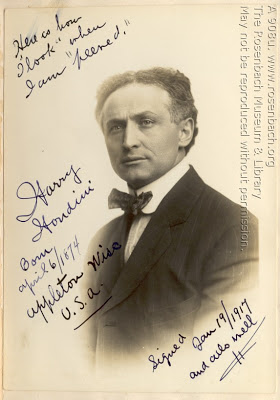 He had previously visited Dr. R. in his shop and sent him a copy of his 1908 book on magic, The Unmasking of Robert Houdin, but other than that, they don’t seem to have had much of a relationship, professional or personal. Now, a couple things about this letter. I don’t have much of substance to say about it, but I’ll go ahead anyway. One can’t help but notice his photograph on the letterhead. The Library of Congress has a sample of this letterhead, too. They suggest Houdini’s use of photos on his letterhead was a promotional device. That’s partly what I figured. It couldn’t have been cheap to produce this kind of thing at the time, so it had to be worth the investment — if it was a promotional tool, that would have helped justify the expense. I also wondered if it was a way to streamline the process of answering fan requests for photos. (If fans even wrote celebrities asking for photos in those days… Well, if they wrote without requesting or expecting a photo it was a bonus to get one on the stationery — brilliant, Harry!) The sheet shown on the Library of Congress’s website has a note in Houdini’s hand indicating it was made according to a secret process in Stuttgart, Germany. Of course Houdini’s stationery has to be produced by a secret process in a foreign country. How else would the master of escape and magic get his letterhead? The Library of Congress document also has a note in Houdini’s hand that states that he adopted this letterhead in 1913 after the death of his mother. The Library of Congress understands his note to mean that the new letterhead reflected a more sober Houdini, still mourning his loss. How is that somber tone represented: in the simple design, the lack of extraneous promotional headlines? I’m not sure. It’s interesting to note, though, Houdini pasted into book he sent Doctor Rosenbach (mentioned in the post-script to his letter to Dr. R.) a signed copy of the same photo that appears on the letterhead (see the top of this post.) In regard to the photo, he writes that it shows what he “look[s]” like when he’s “peeved.” I suppose peeved is one way you might feel after your mother dies but something seems a little incongruent about that reading of the photo when considered along side the notion that it reflects his sorrow. Yeah, you’re right, he inscribed the photo four years later, so who knows what was going on. Curious, though, isn’t it? Either way, Houdini’s picture is on his letterhead and that’s the sign of a true superstar. Another sign of a true superstar is the one name signature. If you’re a celebrity with a name like “Houdini” (and I suppose that’s partly why Ehrich Weiss chose “Harry Houdini” as a stage name — it has a little more zip to it) I guess you can get away with signing just your last name. Especially if your picture and full name are printed at the top of the page, right? It doesn’t surprise me that he would sign his letters that way, but it’s fun to see that he actually does. And it adds a bit of panache to his persona, essential for a magician, I would think. (So does Prince sign his letters just “Prince” or does he add “Rogers Nelson,” too? And what about all of those Brazilian soccer players? Ronaldo? Ronaldinho? Kaká ? Fred?) I should note that the other Houdini signatures at the Rosenbach include his first name, as in the photo above and in the other inscription in the book: