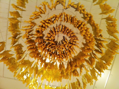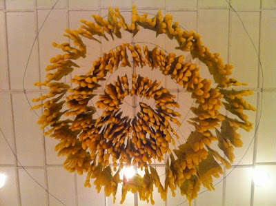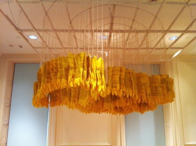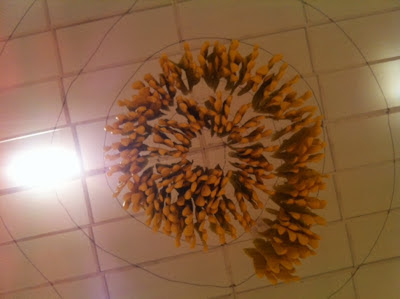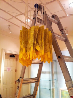 Looking up from underneath provided a great vantage point from which to watch the arrangement of gloves grow. (Please pardon the strange light effects from our ceiling fixtures)