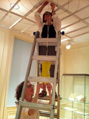 With Bloomsday only two days away, we thought we’d share some behind-the-scenes photos of the installation process for Jessica Deane Rosner’s Ulysses Glove Project, which is being displayed as part of the exhibition Thy Father’s Spirit: A Bloomsday Exhibition of Contemporary Art and Literary Manuscripts. The piece is a tribute to Rosner’s father, a Ulysses fan, and features the entire text of the novel written out on 310 kitchen gloves. Each of these gloves had to be individually suspended from an armature attached to the ceiling and it took nearly two full days to hang the gloves. Of course that’s nothing compared with the two and half years it took Rosner to create them.