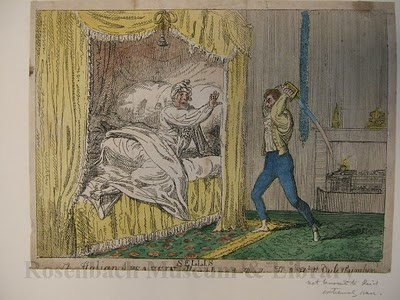 Even the most industrious researcher can be waylaid by a red herring. Today we’ll relate the tale of “The Italian Assassin” and the clues that led (and misled) the collections and library staff at the Rosenbach to discover the story behind this George Cruikshank print. The print in question shows a man brandishing a saber at a man in bed, and the catalog record records the inscription at the bottom as “S. ELLIS/ The Italian Assassin”. The rest of the inscription is cut in half vertically and is hard to make out. There is also an enticing handwritten note “not known to Reid, extremely rare,” which is guaranteed to ignite the imagination of a researcher. This hand-colored etching is part of the large collection of Cruikshank illustrations here at the Rosenbach, which Kathy discussed in her last post. It fell to me, as a collections intern, to see what I could find about the subject and date of this lovely little print. Some cursory research on Cruikshank reveals that he published a book called Italian Tales in 1824, but it contained 16 full page woodcuts, not etchings. Though there are several good catalogues, looking into all known Cruikshank illustrations would be a huge task, as he was incredibly prolific. As an aside, Dr. Rosenbach himself wrote a guide to the Cruikshank materials in the Widener Collection, now at Harvard. In order to narrow down my focus, I tried searching for a connection between “S. Ellis” and Cruikshank, which led me to an author named Sarah Stickney Ellis. But what connection could there be between Mrs. Ellis, author of The Women of England: their social duties and domestic habits and The Italian Assassin? Cruikshank may have illustrated her book My brother, or The man of many friends (1855), but this somewhat promising lead turned out to be a dead end. I thought it was time to put this mystery into my ever-growing pile of unsolved cases, but luckily, Elizabeth, the Rosenbach’s librarian, thought to quickly try searching for “Sellis” rather than S. Ellis, to see if anything might turn up—and turn up it did! Joseph Sellis was a valet of Ernest Augustus, Duke of Cumberland (later King of Hanover). On May 31st, 1810, the Duke was awoken by some stirrings in his chamber and found himself under attack. The would-be assassin, intent on chopping off the Duke’s head, somehow managed to hit the Duke’s sword instead and fled upon realizing his failure. (What the sword was doing so near to the sleeping Duke is another question.) The Duke called in one of his servants and had him go to fetch Sellis, who was found lying dead on his bed. The official story was that Sellis had attempted to kill the Duke and had committed suicide after returning to his room, but rumors abounded. Suspicions arose because Sellis was found nearly decapitated in his room, his wounds a little extreme to be self-inflicted. The washbasin in Sellis’ room was also tainted with bloody water, and it’s quite unlikely that Sellis would have slit his own throat, washed his hands, and only then settled down to die. As the Duke was fairly unpopular, naturally, many people suspected him of offing his own servant and then inventing the botched assassination as a cover. Among the rumors was that the Duke had had an affair with Sellis’ wife, or was having an affair with his other valet (the one who discovered Sellis’ dead body). He was also later accused of siring a son by his sister. The Duke had, in fact, married his first cousin in typical royal fashion, but most of these rumors were attributed to political maneuverings and even his quarrels with Queen Victoria didn’t prevent him from living happily as King of Hanover until his death in 1851. And to think, this interesting story might never have come to our attention had Elizabeth not noticed the potential mis-transcription of S.ELLIS for SELLIS. Armed with our knowledge of the backstory, the full inscription can be made out as “SELLIS/ The Italian Assassin Attempting to Murder H.R.H. The Duke of Cumberland.” What a difference one little period can make! * the Duke successfully won a libel suit against one of the publishers of the scandalous rumorsP.S. (From Kathy) Click here to see another interesting Cruikshank print involving Sellis and the Duke.