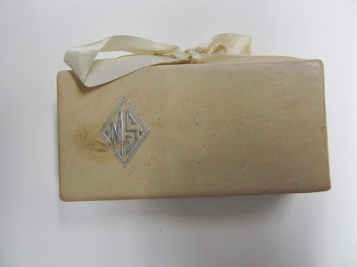 Some of the paper is stuck to the cake and the foil is torn, so I didn’t want to risk further damage by unwrapping it for a picture, but I was able to open it slightly to give a glimpse of the cake itself. The cake is dark brown; I am not an expert in cake conservation, so I don’t know if it was originally dark or if the color changed with age. According to a quick internet search, fruit cake and other dark cakes are often used for the groom’s cake, which is the cake often distributed as favors.