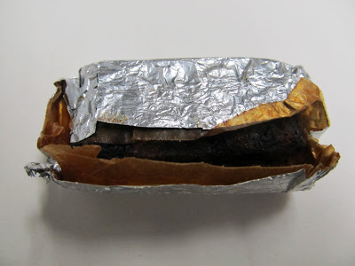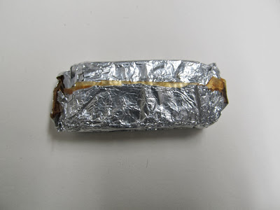 The piece of cake is about 1 1/4″ x 3″ and is wrapped in wax paper and then in foil.
