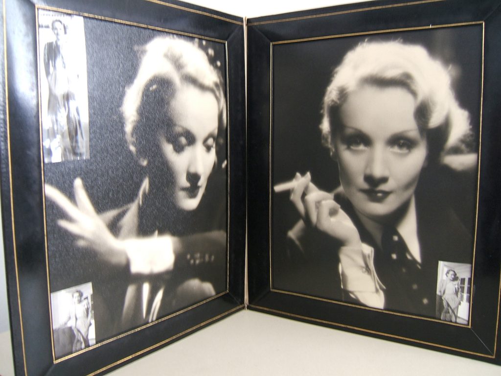In her autobiography, Here Lies the Heart, Acosta talks of seeing Marlene Dietrich at a dance recital in 1932, exchanging glances, and having her show up at her door the next day with white roses and an offer to cook for her because “You seem so thin and your face so white that it seems to me you are not well.” This odd start proved no obstacle to a passionate affair, any more than Dietich’s open marriage or Acosta’s lifelong obsession with Greta Garbo and her fondness, as recounted in Maria Riva’s Dietrich biography, for talking about Garbo more frequently than the weather. Later in life, and in need of cash, Acosta sold her archive of keepsakes from lovers and friends, including Dietrich, to the Rosenbach. The photos of Dietrich in this post are from Acosta’s collection; the double picture frame at the top of this page–with two glamour shots of Dietrich and candid shots by Acosta tucked in the corners–is typical of the way Acosta curated her memories. In addition to being criticized for not blossoming into a second Eugene O’Neil, Acosta is also criticized for fervently archiving her romances with glamorous women. But in a time when even Liberace couldn’t come out, the queer imagination, without mutilating itself, could only expand inwardly, like a chambered nautilus in reverse.