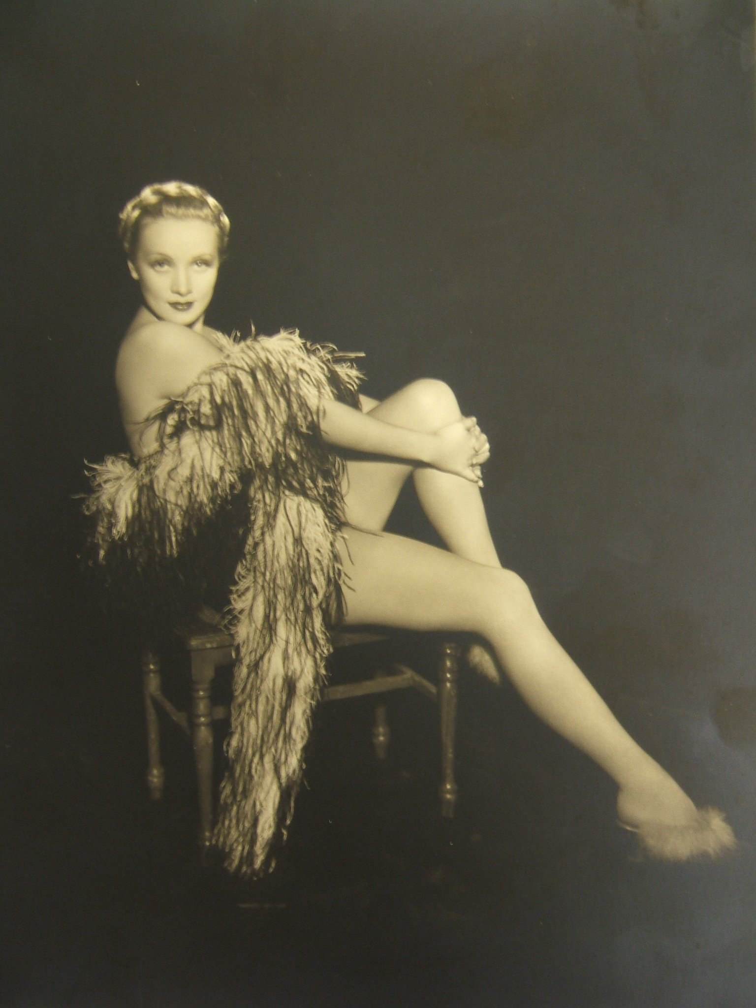 As we contemplate the symbolism this stocking may have had for Acosta I would be remiss not to mention that Dietrich was renowned for having the greatest legs in Hollywood. Dietrich films often have a gratuitous shot of her taking off shoes or adjusting a stocking while we all, presumably, gawk; General Patton’s code name for Dietrich in World War II was LEGS; she began her act for the soldiers by poking one of these legendary limbs through the curtain; one of her stage bits when entertaining the troops was to hike up her skirt and play a musical saw. Here’s a publicity shot from The Song of Songs, a film Dietrich made the year she met Acosta: