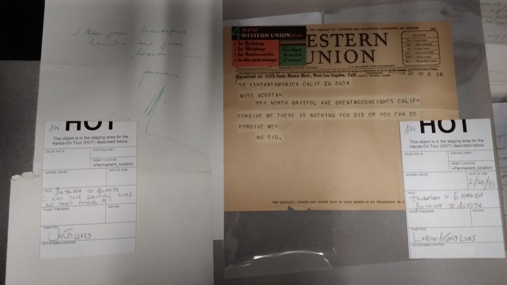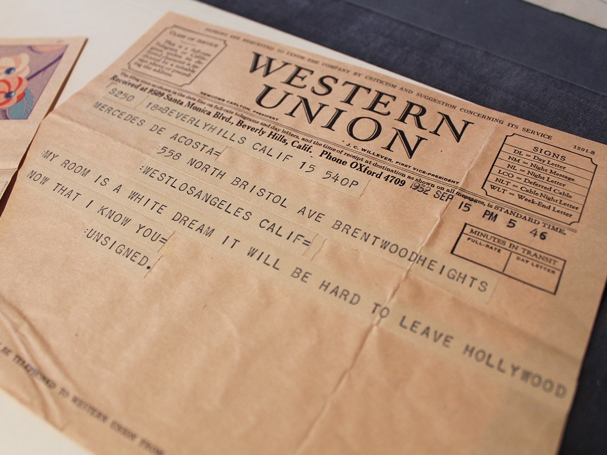 Robert A Schanke’s That Furious Lesbian: The Story of Mercedes de Acosta, tells how Acosta’s archive came to the Rosenbach. “I would not have had the heart or courage to have burned those letters…” Acosta wrote to the Rosenbach’s then-director, William McCarthy. “So it seemed a God-sent moment when you took them.” I apologize that the images below are not crisper, but as I am writing from home I’m relying on photos I took for research while preparing the Rosenbach’s Behind the Bookcase tour “20th Century Lesbian and Gay Lives.” Here, in the green ink all of Dietrich’s letters at the Rosenbach are written in, is the most sweetly concise love letter ever, a full sheet of paper saying only “love, Marlene.” To the right is page two of a breathless note in which Dietrich apologizes to Acosta for breaking dinner plans and says “I will be there not later than 9:30 or 10, please do eat and go to bed and wait for me there—forgive me, I will hurry— love love, M.”