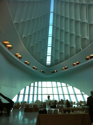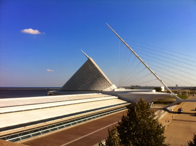 For those of you who haven’t been to the Milwaukee Art Museum, which sadly includes me, the building is architecturally fascinating. The War Memorial building was designed by Eero Saarinen in the 1950s and a postmodern addition by Santiago Calatrava was added in 2001. The addition features a movable sunshade whose wings open and close on a daily schedule. Here is an exterior picture taken by our curator, Judy Guston, when she went to supervise the installation of our paintings; you can find more images and information on the MAM website.