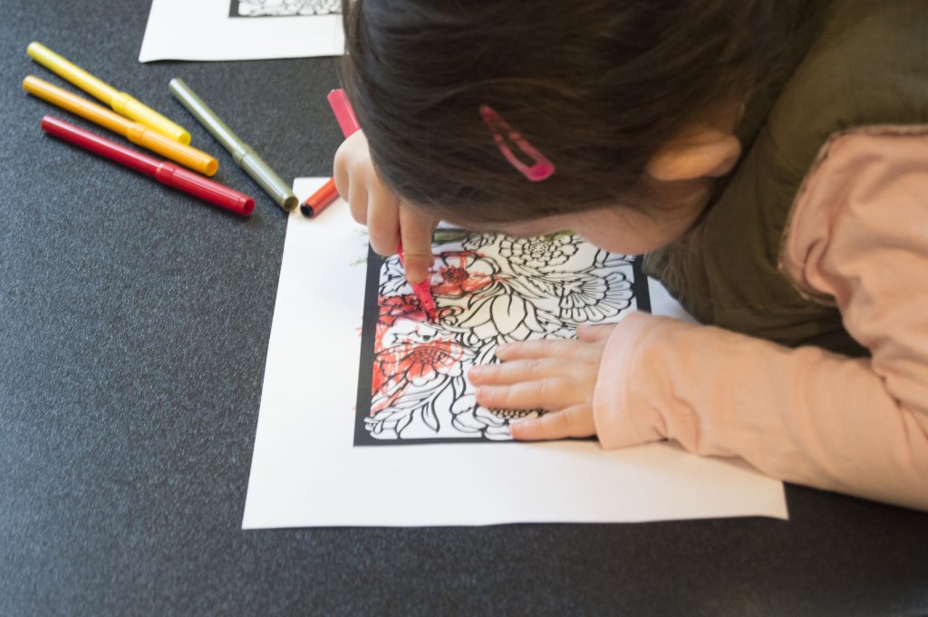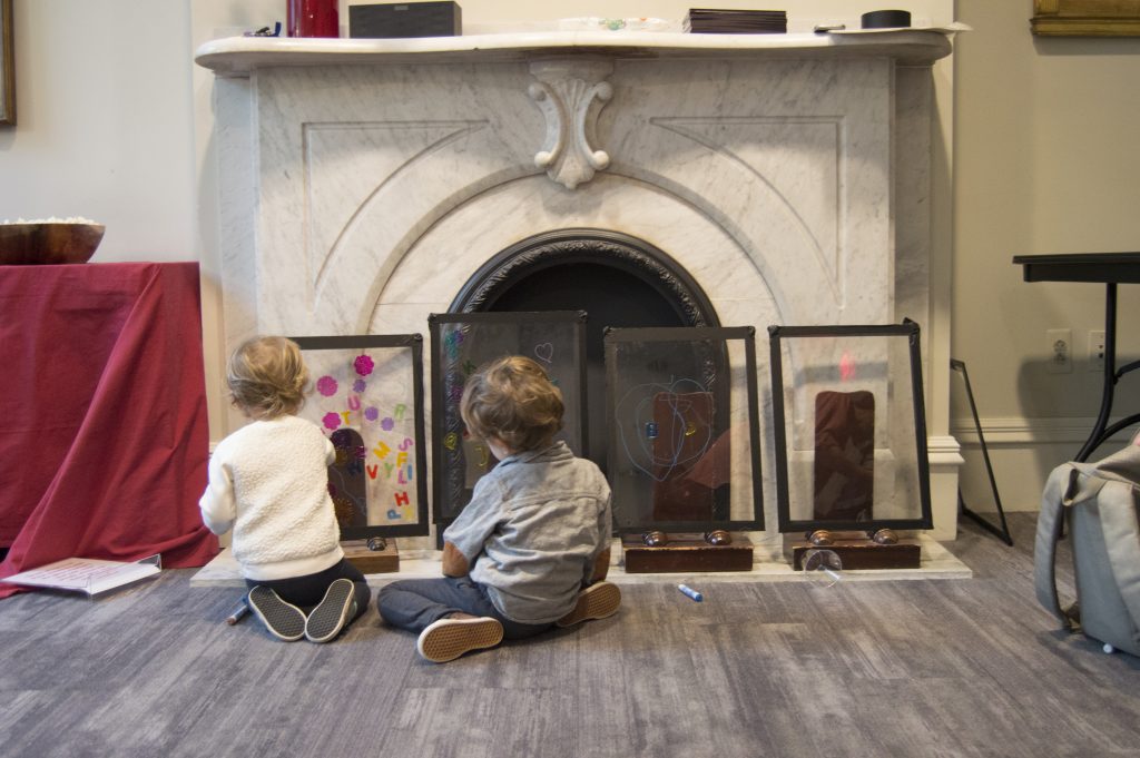 Because it was a chilly morning on Delancey Place, we didn’t want to venture outside after the story to look for windows. So, instead we peered out one of the big bay windows and described what we saw outside. We were lucky enough to have a crew from Philadelphia Gas Works parked in front of the museum. So in addition to seeing big, old trees, we saw a man with a hard hat using a jack hammer and a picture of the Philadelphia Eagles team logo on the side of the truck, which one of the children described as a “football bird.” Then it was time to take a trip into the Rosenbach brothers’ home to see if we could find a window that has pictures of people on it. We take our time preparing for our visit into the “fancy house.” The kids must take their grown-up’s hand and temporarily leave all snacks and sippy cups behind. But children are used to following rules and I tell them that we need to keep the fancy house clean so eventually, they willingly and cheerfully leave their snacks. And once we step into the Rosenbach brothers’ home, the kids are dazzled by all the silver sconces and sparkly chandeliers, the mirrors, the imposing staircase and ornate furniture. But they quickly remember their purpose, to seek out the window with pictures of people on it. Four-year-old Zoe spies the stained glass windows first and the rest of the group quickly follows as she enthusiastically pulls her mom by the hand towards the end of the hallway. We settle down on the floor in front of the colorful windows and I explain that this type of window is called stained glass. Then we try to figure out what the people are doing. Zoe, who obviously has a an eagle eye, notices that one of the ladies is playing music. Then I explain that we’re going to head upstairs where they can make their own stained glass windows. There is a ripple of excitement and anticipation. And, as we head back through the story room towards the art adventure awaiting them upstairs, the kids troop past their sippy cups and snacks, abandoning them in favor of stained glass making. And that is the power of Museum Adventures at the Rosenbach!