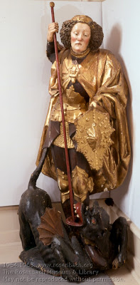Now, nothing against this fine piece, or more technically, this “polychrome carved and gilded lime wood figure of St. Michael slaying a demon” as our catalog describes it, but encountering the somewhat melancholy, nearly blasé St. Michael (one would think that slaying a dragon would evoke a more impassioned expression) ramming a spear down the throat of a dragon/demon who does, indeed, as our catalog further describes, have “teeth, wings, and protruding ribs and… a face on its posterior” (complete with curiously positioned nasal aperture…), can be a little disconcerting at times. I don’t run into the following sculpture nearly as often as I do St. Michael, as it’s tucked at the end of a second-floor hallway that isn’t a main thoroughfare in our historic house (and may be missed by visitors on a house tour as well), and so I hadn’t thought much about it: