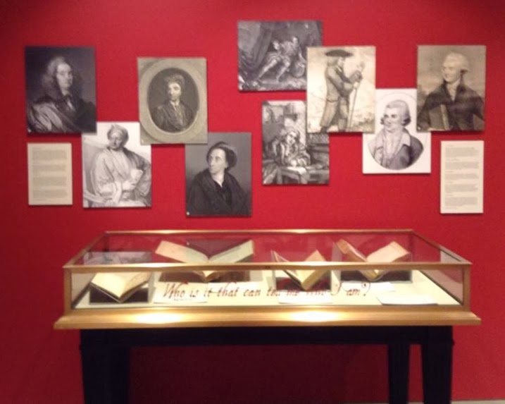 One of my favorite sections of the exhibit was a case devoted to 18th-century editions of Shakespeare and the development of Shakespearean scholarship. Alexander Pope (the man in the lower center, wearing a banyan and turban), wrote a very famous edition of Shakespeare in 1725, and Lewis Theobald (shown writing at his desk, to Pope’s right) took him to task for his editorial liberties and errors the following year in Shakespeare Restored, or a Specimen of the many Errors as well