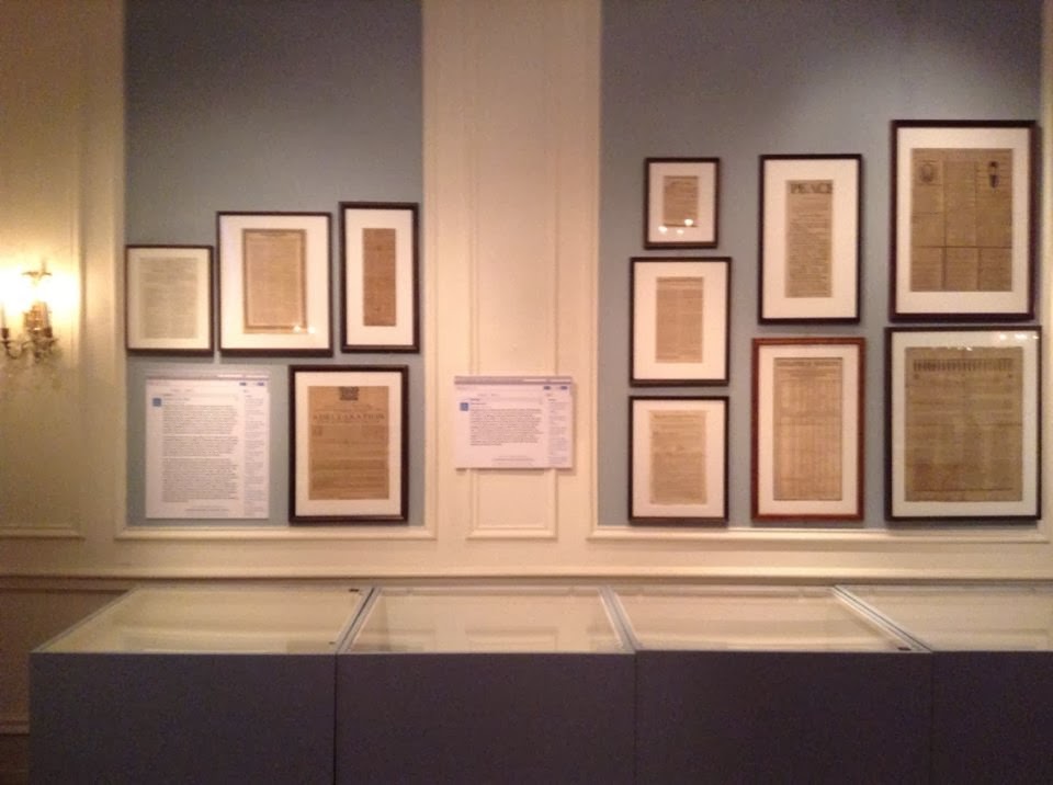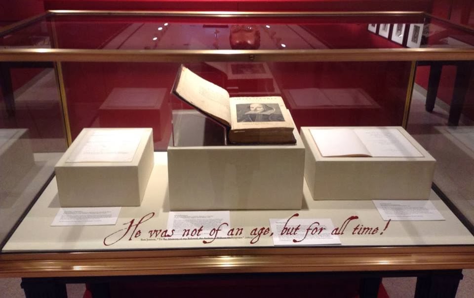 Farrar Fitzgerald and I hiked up 20th street to take a look at Shakespeare this afternoon and had a great time. The first item as you walk into the gallery is their First Folio, which was a gift from P.A.B Widener and Josephine Widener Wickfeld; it is shown right next to a Free Library memorandum explaining how Library board member Dr. Rosenbach wanted to surprise the rest of the board with the gift and asked for a book truck to be placed next to his chair at a trustee meeting.