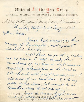 The Rosenbach has another set of letters between Dickens and Dixon regarding a statue of Shakespeare. “I dread the vision of a statue… shiver and tremble at the thought of another graven image in some public place,” he writes. He felt Shakespeare’s best monument was his work and that the money would be better used to finance scholarships. Nonetheless, he did put up £10 for the project. I wonder if his willingness, albeit reluctant, to memorialize Shakespeare in this wise indicated anything about his feelings toward the Bard…