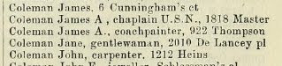 The earliest residents of 2010 appear to have been members of the Coleman family. Mrs. Harriet Drayton purchased the property in 1866 and it passed to her relative Anne L. Coleman in 1867, who lived in it until 1886. There is also an unexplained record of a Jane Coleman, gentlewoman, residing at 2010 Delancey in the 1865 edition of McElroy’s Philadelphia city directory, prior to the purchase by Mrs. Drayton, but we haven’t been able to sort out what exactly this means.