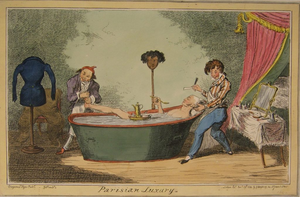 This is an English print and the British were pretty slow to catch on to hot bathing. You can read a great article on colonial bathing on Colonial Williamsburg’s website, and although by 19th century bathing was becoming more common, this print clearly indicates that it was still seen as characteristically (even foppishly) French. Napoleon had famously been a fan of hot baths. A widely quoted excerpt from a memoir by his friend and secretary Louis Antoine Fauvelet de Bourrienne explains: