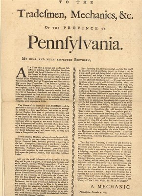 The Pennsylvania “Mechanic” warns, in no uncertain terms that “The East India Company, if once they get Footing in this (once) happy country, will leave no Stone unturned to become your Masters. They are an opulent Body, and Money or Credit is not wanting amongst them They have a designing, depraved, and despotic Ministry to assist and support them. They themselves are well versed In Tyranny, Plunder, Oppression and Bloodshed. Whole Provinces labouring under the Distresses of Oppression, Slavery, Famine, and the Sword, are familiar to them.”