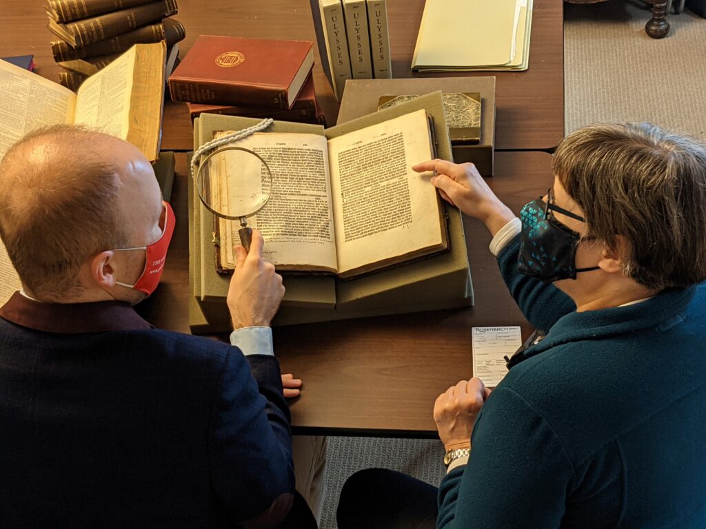 Alexander L. Ames and Elizabeth E. Fuller study Rosenbach collection items in the reading room.