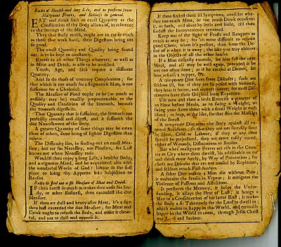 “Eat and drink such an exact Quantity as the Constitution of thy Body allows of, in reference to the Services of the Mind. They that study much, ought not to eat so much as those that work hard, their Digestion being not so good. The exact Quantity and Quality being found out, is to be kept to constantly. Excess in all other Things whatever, as well as in Meat and Drink, is also to be avoided. Youth, Age, and Sick require a different Quantity. And so do those of contrary Complexions; for that which is too much for a flegmatick Man, is not sufficient for a Cholerick. The Measure of Food ought to be (as much as possibly may be) exactly proportionable to the Quality and Condition of the Stomach, because the Stomach digests it. That Quantity that is sufficient, the Stomach can perfectly concoct and digest, and it sufficeth the due Nourishment of the Body. A greater Quantity of some things may be eaten than of others, some being of lighter Digestion than others. The Difficulty lies, in finding out an exact Measure; but eat for Necessity, not Pleasure, for Lust knows not where Necessity ends. Wouldst thou enjoy a long Life, a healthy Body, and a vigorous Mind, and be acquainted also with the wonderful Works of God? labour in the first place to bring thy Appetite into Subjection to Reason. Rules to find out a fit Measure of Meat and Drink. If thou eatest so much as makes thee unfit for Study, or other Business, thou exceedest the due Measure. If thou art dull and heavy after Meat, it’s a sign thou hast exceeded the due Measure; for Meat and Drink ought to refresh the Body, and make it chearful, and not to dull and oppress it. If thou findest these ill Symptoms, consider whether too much Meat, or too much Drink occasions it, or both, and abate by little and little, till thou findest the Inconveniency removed. Keep out of the Sight of Feasts and Banquets as much as may be; for ’tis more difficult to refrain good Cheer, when it’s present, than from the Desire of it when it is away; the like you may observe in the Objects of all the other Senses. If a Man casually exceeds, let him fast the next Meal, and all may be well again, provided it be not too often done; as if he exceed at Dinner, let him refrain a Supper, &c. A temperate Diet frees from Diseases; such are seldom ill, but if they are surprised with Sickness, they bear it better, and recover sooner; for most Distempers have their Original from Repletion. Use now and then a little Exercise a quarter of an Hour before Meals, as to swing a Weight, or swing your Arms about with a small Weight in each Hand; to leap, or the like, for that stirs the Muscles of the Breast. A temperate Diet arms the Body against all external Accidents; so that they are not so easily hurt by Heat, Cold or Labour; if they at any time should be prejudiced, they are more easily cured, either of Wounds, Dislocations or Bruises. But when malignant Fevers are rife in the Country or City where thou dwelst, ’tis adviseable to eat and drink more freely, by Way of Prevention; for those are Diseases that are not caused by Repletion, and seldom attack Full-feeders. A sober Diet makes a Man die without Pain; it maintains the Senses in Vigour; it mitigates the Violence of Passions and Affections. It preserves the Memory, it helps the Understanding, it allays the Heat of Lust; it brings a Man to a Consideration of his latter End; it makes the Body a fit Tabernacle for the Lord to dwell in; which makes us happy in this World, and eternally happy in the World to come, through Jesus Christ our Lord and Saviour.”It’s striking how much of this is still valid today. Of course, we no longer worry about our humor type, such as phlegmatic or choleric, when going on a diet, but such advice as bringing one’s appetitite into subjection by reason, avoiding opportunities of temptation like “feasts and banquets,” and taking a bit of exercise by “swinging a weight” is timeless. Not that it necessarily makes it easier to follow.