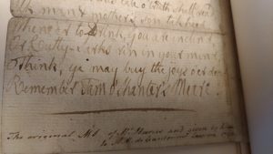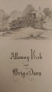 In describing the wonders of his newly acquired Burns collection, Dr. R. wrote, “Perhaps the foremost is the original draft of ‘Tam o’ Shanter,’ written on twelve leaves, which Burns presented to Adam Cardonnel-Lawson in 1790.” This is one of three “Tam o’ Shanter” manuscripts known to exist, and is neatly bound into a book; you see it on the left in the picture above. Along with the manuscript, this unique tome combines background on the setting of Burns’s famous supernatural tale, and drawings by the aforementioned Cardonnel-Lawson—a Scottish artist and antiquarian, and acquaintance of Robert Burns. Below is Cardonnel-Lawson’s drawing of the ruined Alloway Church, where Tam o’ Shanter spies on a witches’ convocation, and the bridge over the river Doon, where he makes his escape: