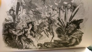 “Bousing at the nappy” here is to drink strong ale—potentially the source of Tam’s troubles later. If Tam o’ Shanter had been sober when he rode past a witches’ rave in the ruined Alloway Kirk, he might have had better control over his tongue and not whistled at a witch in a short chemise (or “cutty sark”). Here’s the pagan conclave Tam intruded upon, in the Rosenbach’s 1830 edition of “Tam o’ Shanter,” illustrated by Thomas Landseer: