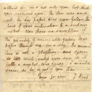 “Be serious! Love is not a plaything — and again do not write unless you can do it with a crystal conscience. I would sooner die for want of you than — Yours for ever J. Keats” Page 3, Letter from John Keats to Fanny Brawne. Collection of the Rosenbach, EL3 K25 MLS ALS.
