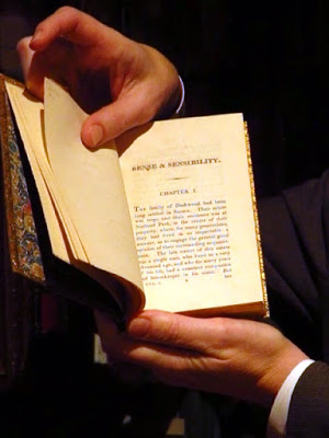 But this edition hides a secret. The first-edition title page hides a later edition of Sense and Sensibility; small differences in print production such as typeface or paper stock reveal the secret. At some point in the life of these books, a cunning dealer pasted in a title page from a first edition book to raise its value for collectors.