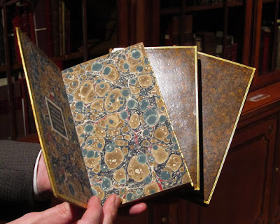 The first-edition title page pictured above resides in a beautiful three-volume set of books with agate marbled endpapers.