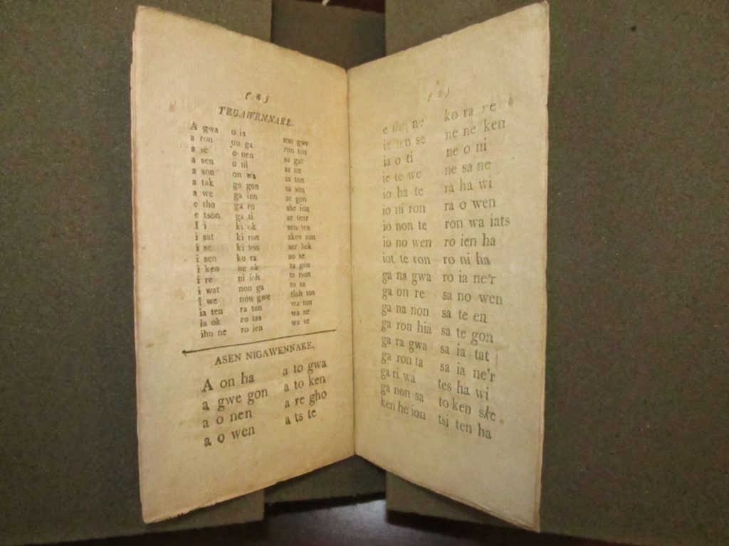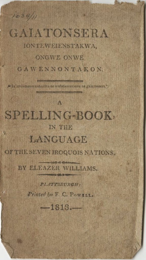 | Eleazer Williams, Gaiatonsera Ionteweienstagwa Ongwe Onwe Gawennontakon: A Spelling–Book in the Language of the Seven Iroquois Nations. Plattsburgh: F.C. Powell, 1813. A 813g |