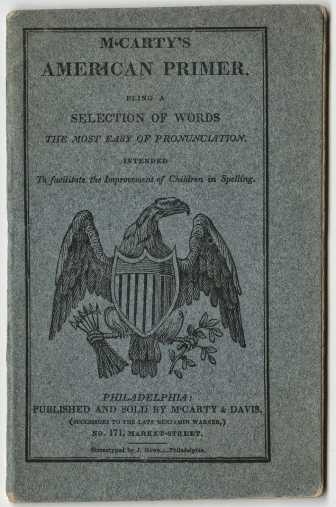 In terms of spelling, M’Carty’s American Primer from 1828 clearly promises “A Selection of Words the Most Easy of Pronunciation Intended to Facilitate the Improvement of Children in Spelling.”