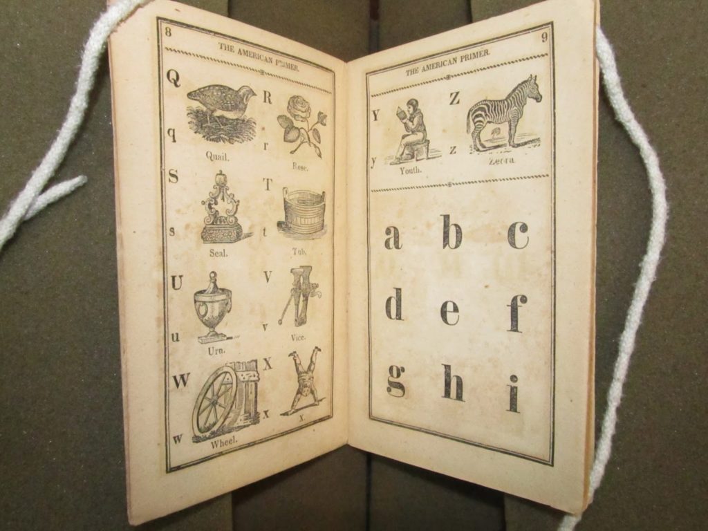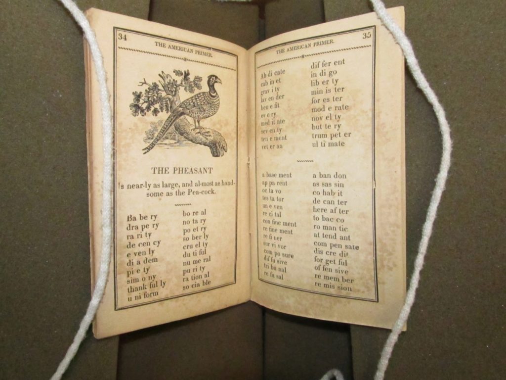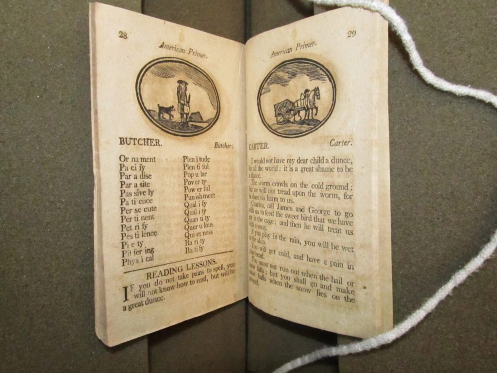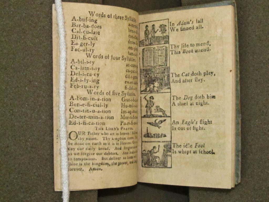 After mastering the alphabet, children would move on to syllables, then words of two and three syllables. Here’s a page of alphabets followed by a page of syllables from The American Primer; Or an Easy Introduction to Spelling and Reading.